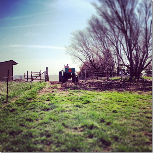 The beautiful weather came just in time for all the farmers here in the mid-west. They were really getting anxious to get in their fields… they includes my husband. He will be baling Hay this summer on part of our land. This field was a MESS when we first arrived, so he needed to disc it down a few times and re-seed it so we get a good hay crop off of it.